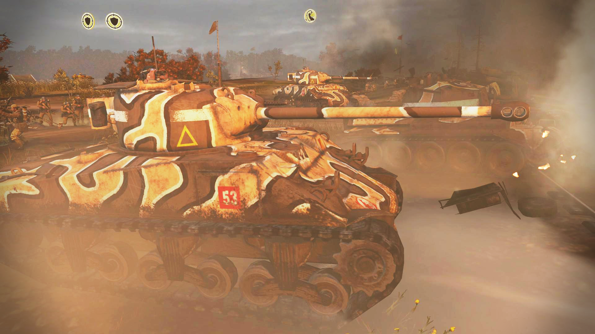 특정 지휘관을 선택하면, 손상된 차량이 제 자리에 정지하여 연막탄 포격을 호출한 뒤, 스스로를 수리할 수 있습니다.