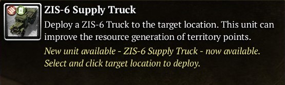 이 때문에 ZIS-6 보급트럭은 추가적인 탄약이나 연료를 유동적으로 수급하고 싶을 때, 소수만 운용하는 것이 좋고, 방어선이 안정되면 트럭을 불러내는 것보단 자원저장소를 짓는 편이 장기적으로 낫습니다. 그래도, 보급트럭 약간 정도는 굴릴만 한데, 전차를 모을 때까지 연료 거점에 배치했다가, 조합이 어느정도 갖춰진 시점에 탄약 거점으로 옮기는 식으로 자원수급을 조절할 수 있고, 나 혼자 먹긴 하지만 어쨌든 보너스 자원량도 많아서, 인력관리만 된다면 충분히 도움이 됩니다. 하지만, 방어병력 없이 트럭만 줄창 부르면, 전선도 붕괴되고, 트럭도 박살나고, 팀원들의 신뢰도 무너지니, 충분한 방어병력을 갖춘 후에 트럭을 호출합시다.