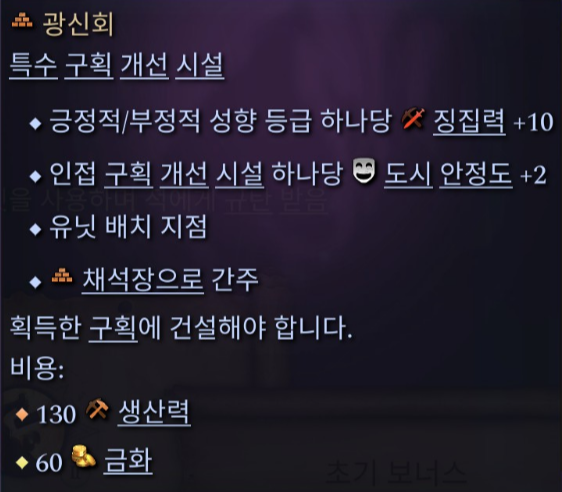 특수 구획 개선 시설은, 도시의 일반 구역을 특수 구역으로 변경하는 것입니다. 예를들어, 도시의 인구가 늘어나서 구역을 확장할 때, 이렇게 확장한 구역(농장, 채석장, 벌목장, 광산, 연구소, 수로) 위에 건설하여, 용도를 바꾸는 식... 일반 구역 시설보다 성능이 좋지만, 건설하는데 추가적인 자원과 시간이 필요합니다. 또, 특수 구획 개선 시설은 한 도시에 하나씩만 지을 수 있습니다.