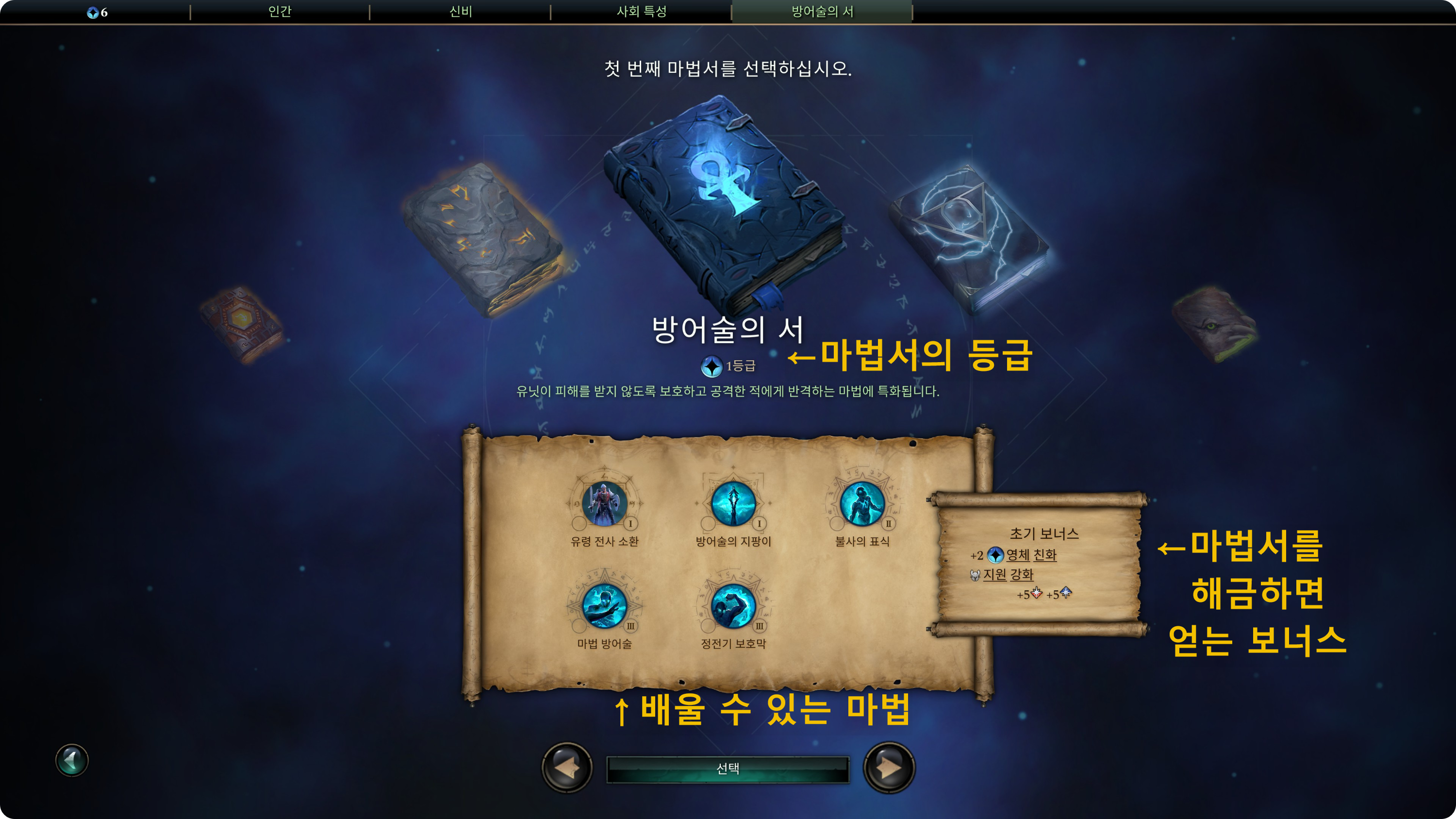 에이지 오브 원더스 4 는 마법서를 선택해서, 해당되는 주문이나 유닛, 건물을 해금할 수 있습니다.
