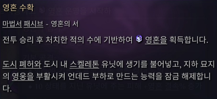 대표적으로 그림자 마법서의 영혼 자원 추가가 있습니다. 그림자 마법서 중, 언데드 관련 마법서를 해금하면, 즉시 영혼 자원 시스템이 추가됩니다.