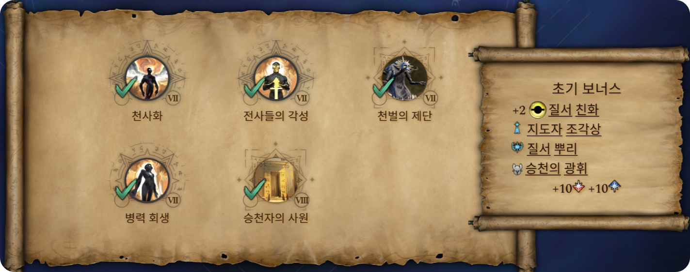 질서 특화 마법서는 다양한 신앙 유닛, 정신 마법, 치유와 버프 마법, 봉신 운영에 특화되어 있습니다.