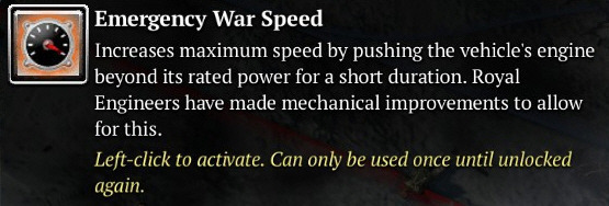 망치를 연구할 경우, 왕립 공병이 영국 차량을 수리하여 긴급 전투속도(Emergency War Speed)란 일회용 스킬을 부여할 수 있습니다. 남은 체력에 상관없이 10초 수리를 하면 스킬이 생성되므로, 망치를 연구하면 체력이 가득 찬 차량도 수리할 수 있습니다.
